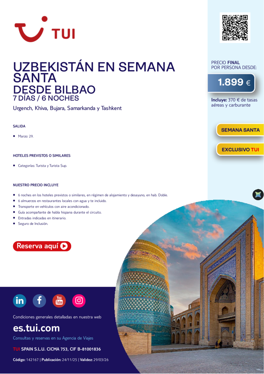 Uzbekistán en Semana Santa. 7 días / 6 noches. Exclusivo TUI. 29 MAR desde BIO desde 1.899 €