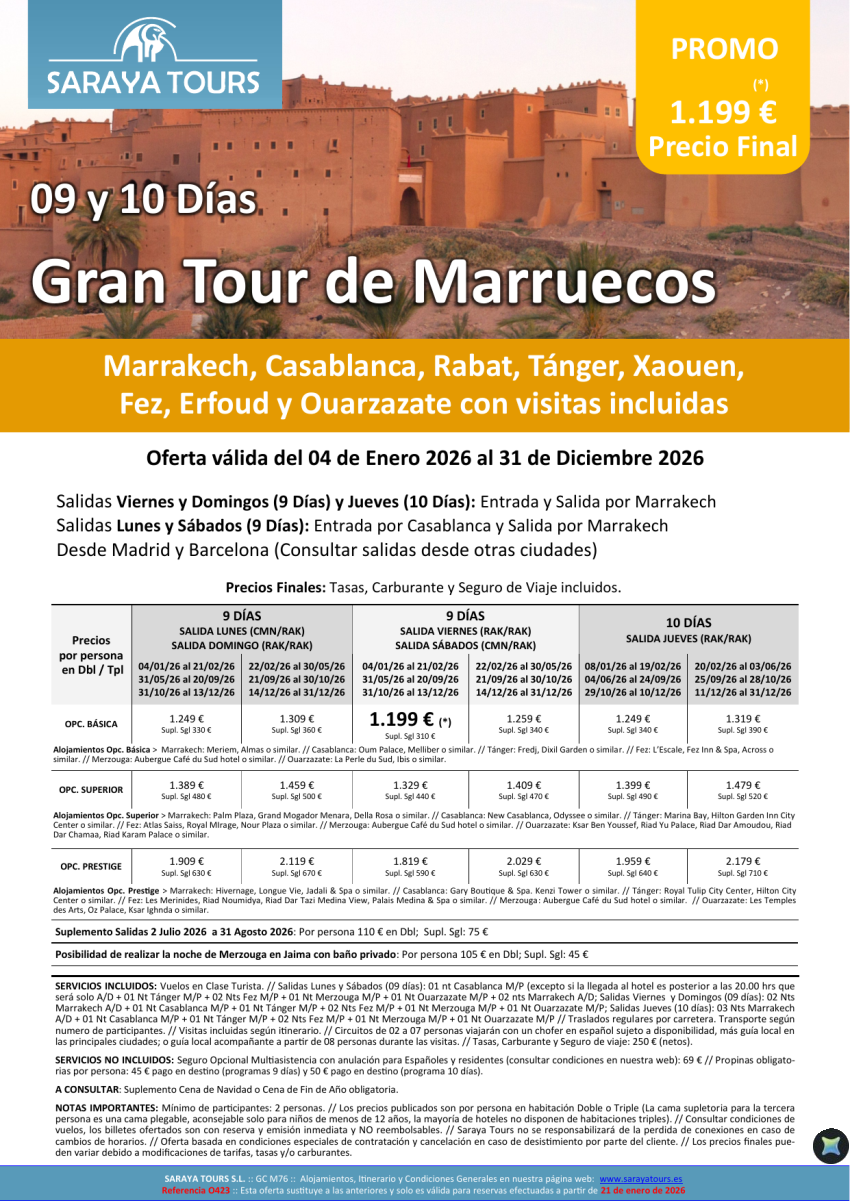 Gran Tour 9/10 días: Rak, Cmn, Rabat, Tánger, Xaouen, Fez, Merzouga, Ouarzazate con Visitas Incl. hasta Dic26