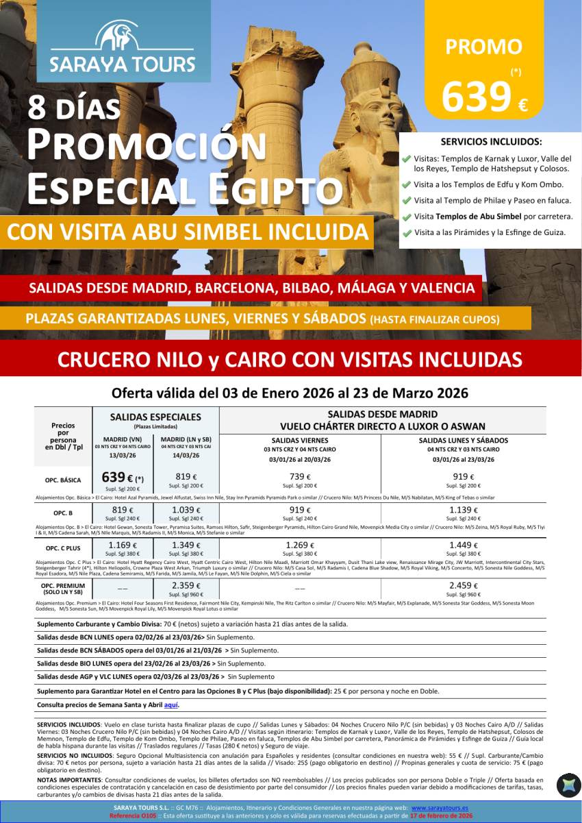 Promo Egipto con Abu Simbel 8días. *Salidas Mad, Bcn, Bio, Agp & Vlc* Crucero y Cairo desde 599 € hasta Dec26