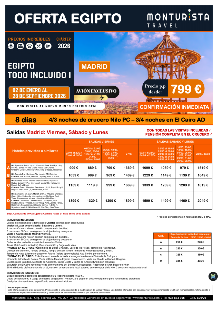 EGIPTO Todo Incluido I**desde 799€ - salida charter MAD, BCN, especiales agp,vlc,bio crucero + cairo + visitas